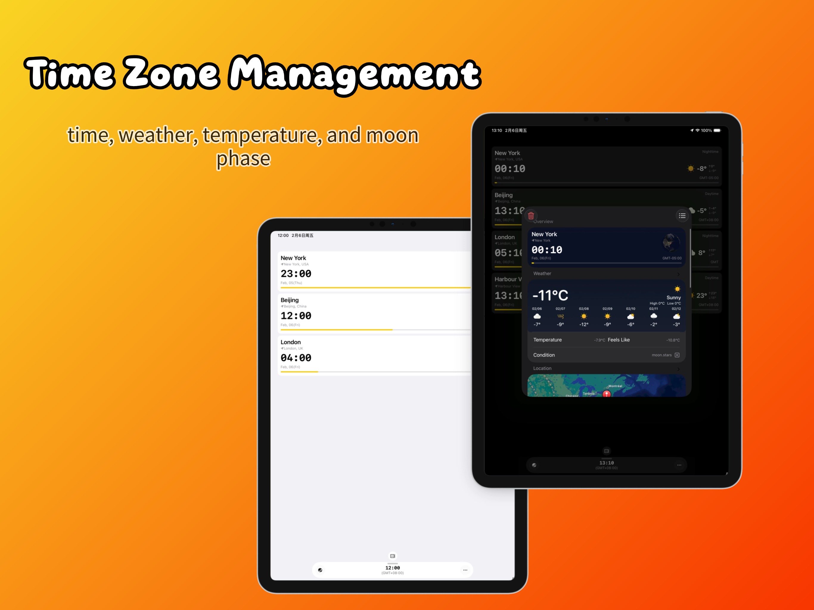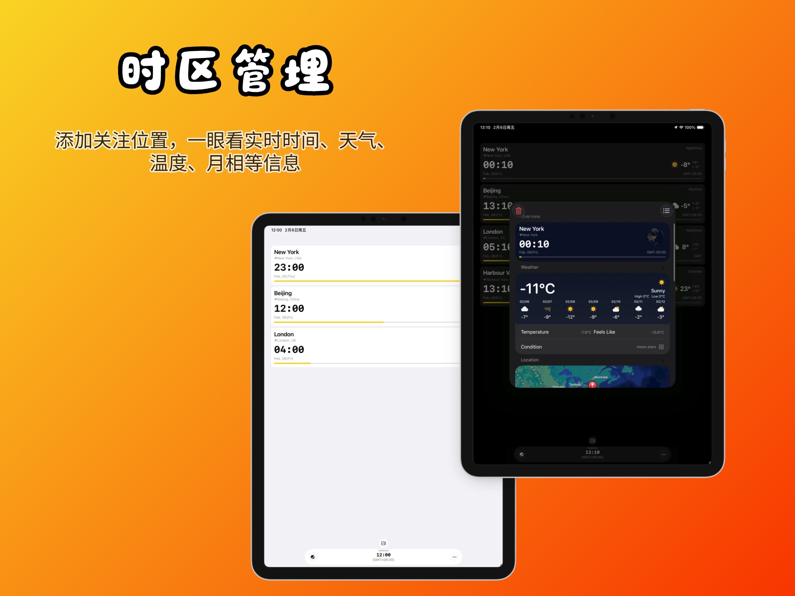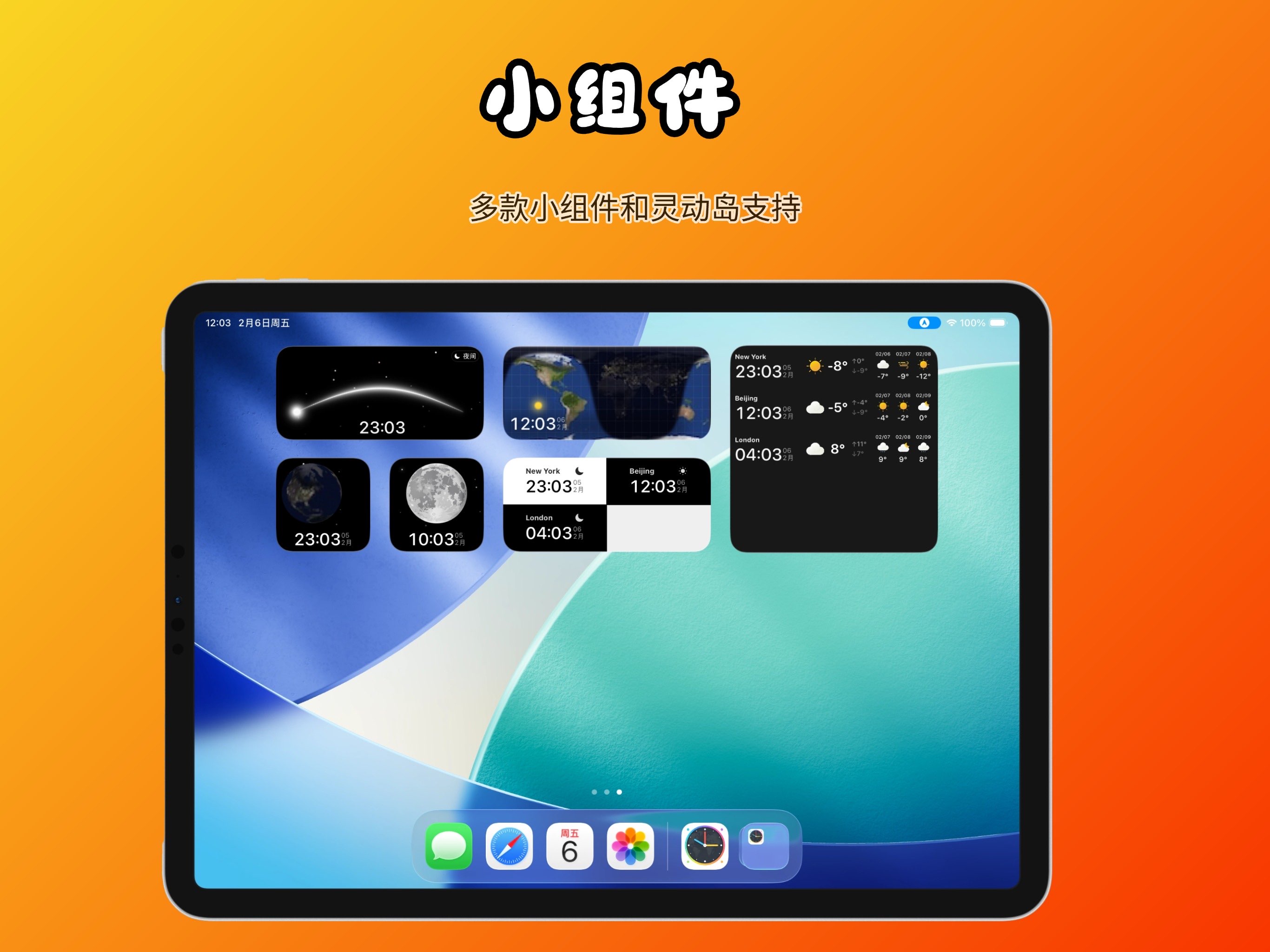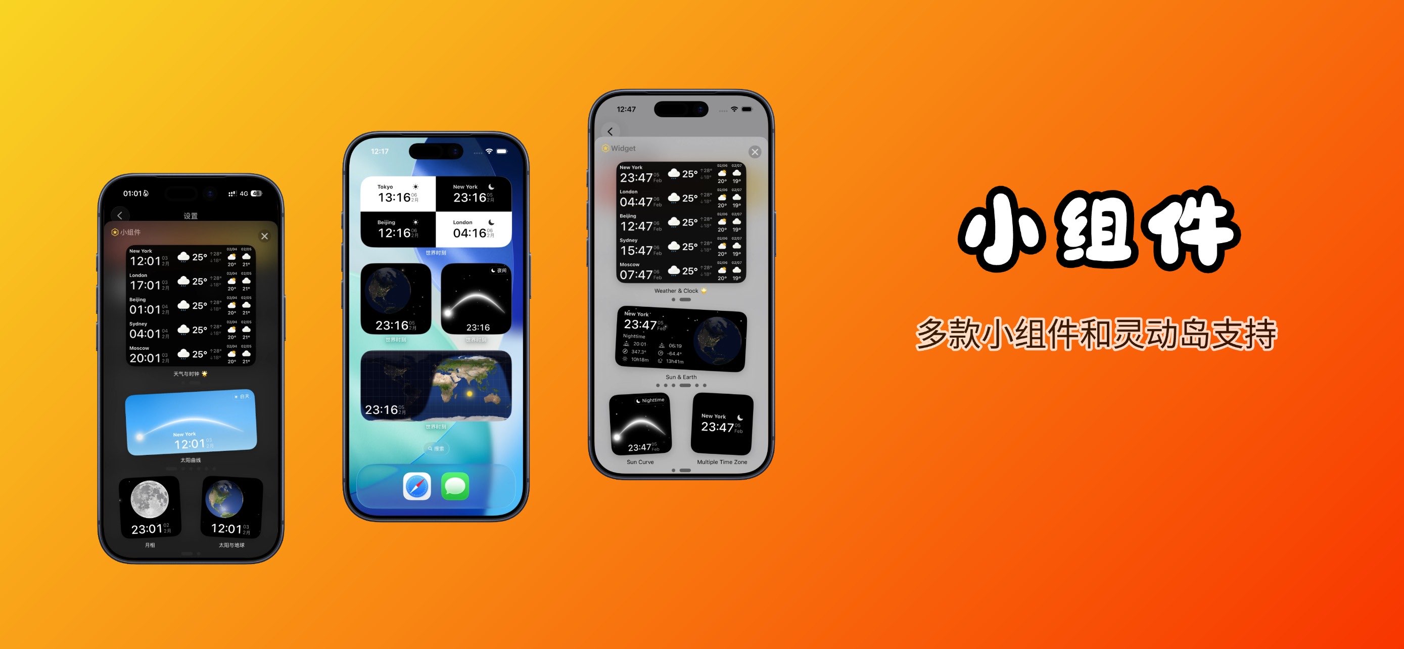 世界时钟,全球时间,时差转换,跨国会议,远程协作,天气预报,月相,日出日落,灵动岛,桌面小组件,WorldClock,Timezone,Widget,Travel